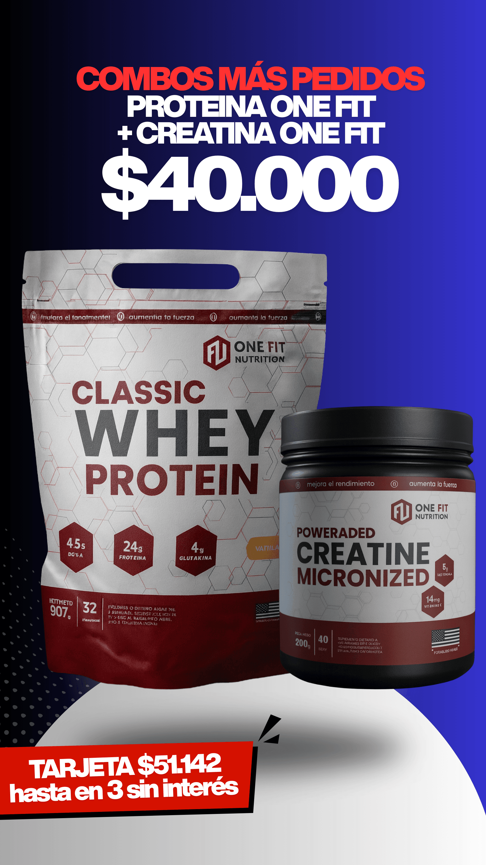 EL COMBO MÁS PEDIDO AHORA EN UNA SÚPER OFERTA PROTEÍNA + CREATINA ONE FIT